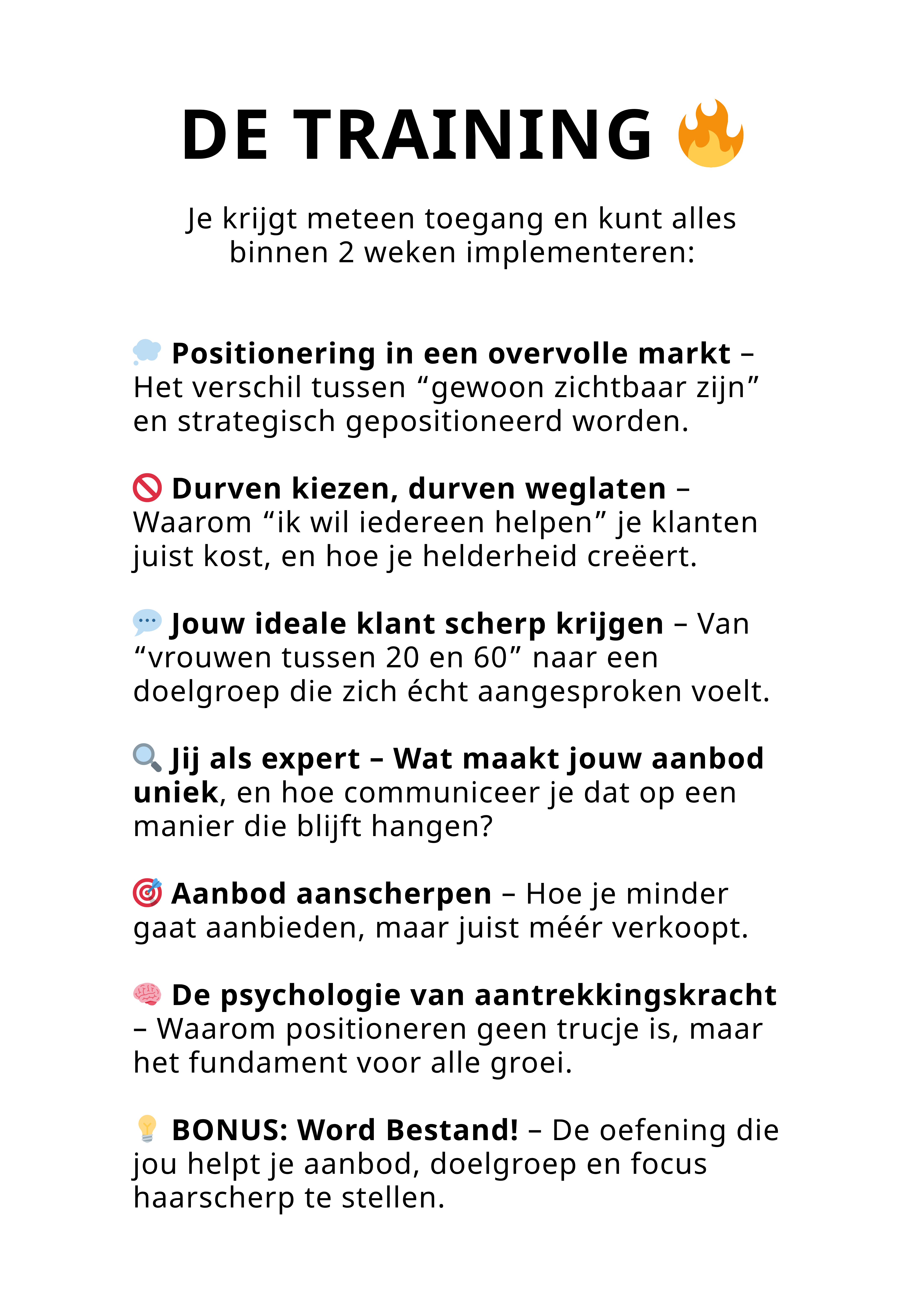 Nee, dit is géén technische cursus. De training gaat over positionering, niet over tools. Het maakt dus niet uit welk systeem je gebruikt — als jij je aanbod goed kunt presenteren, werkt het overal. Het is juist bedoeld om je hoofd én marketing simpel te houden.